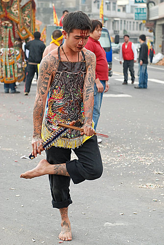 #78. 臉頰穿完銅棒後的乩童.
